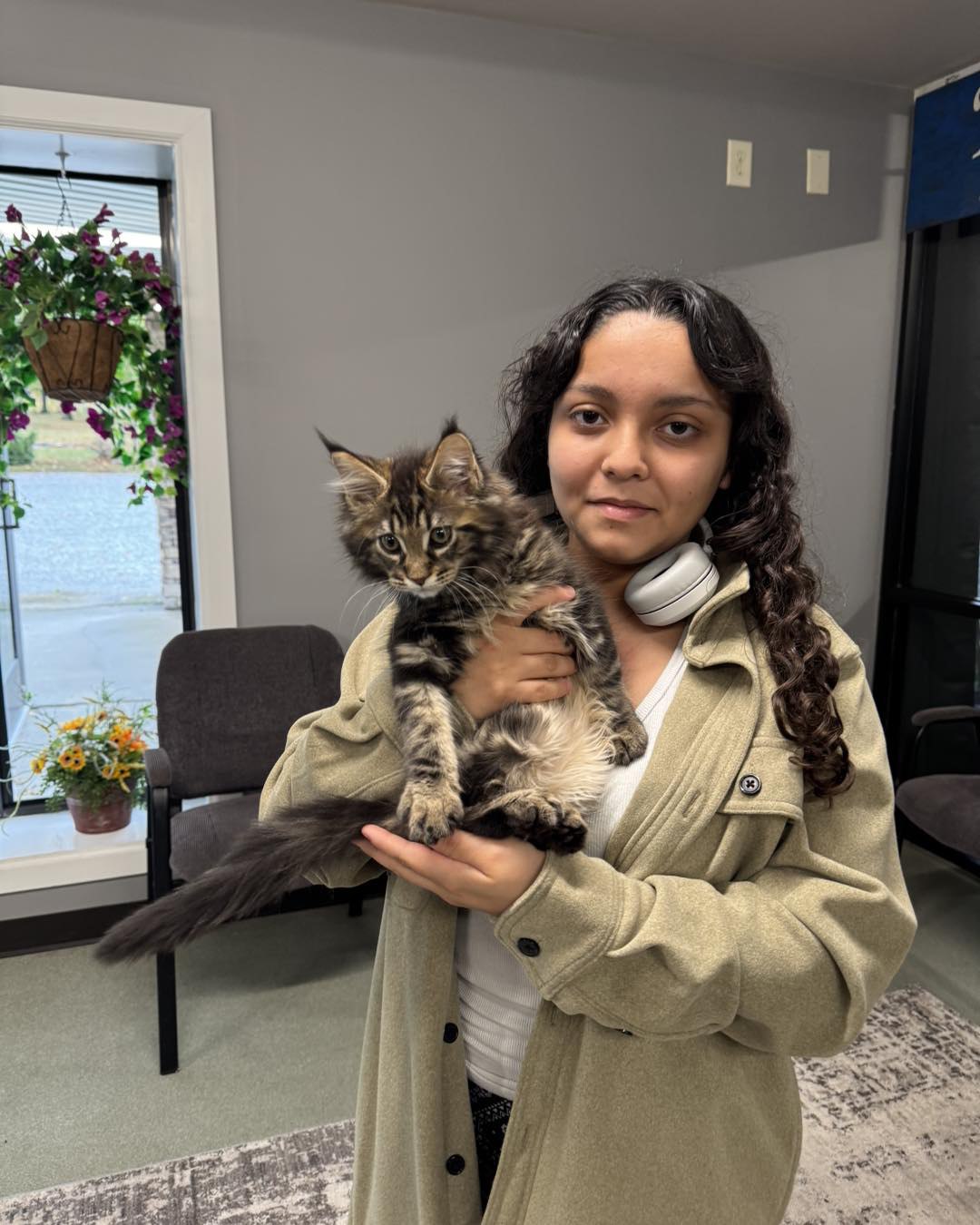 Fawnie is a gentle Maine Coon kitten who is 10 weeks old. She loves playful moments and cuddles, and is ready for a warm, loving home.