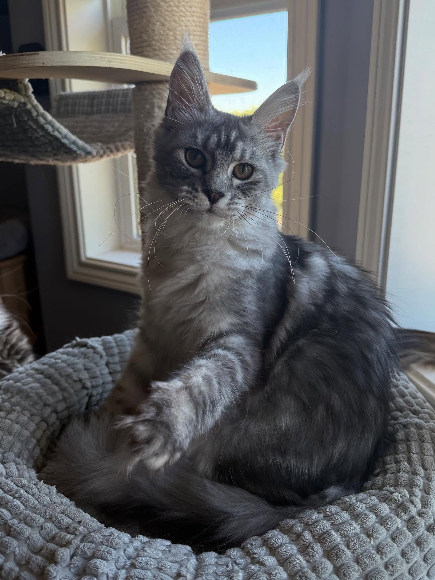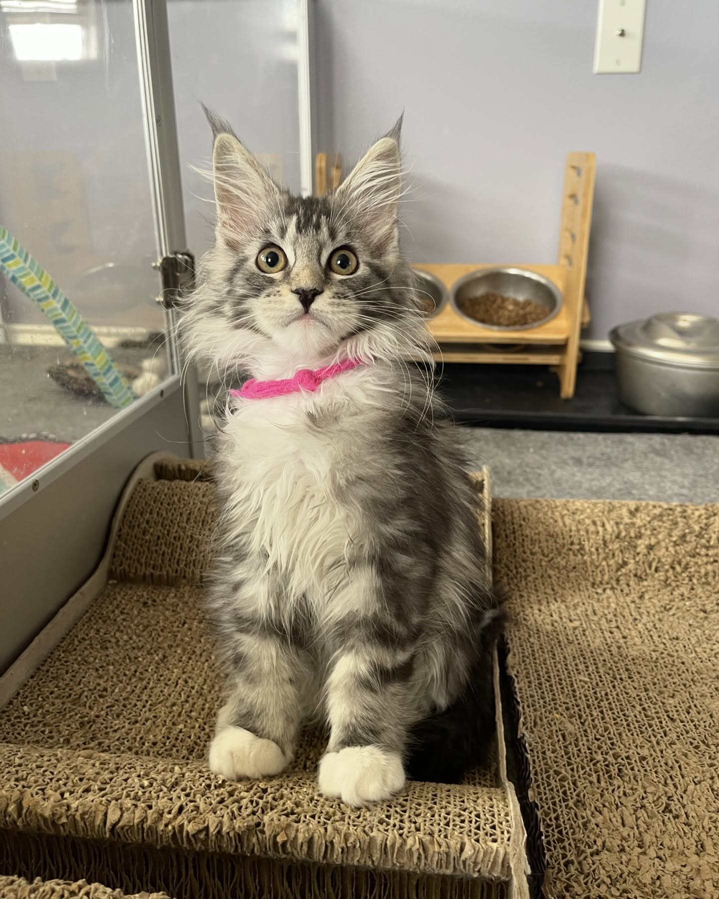 Fione is an elegant Maine Coon kitten who is 10 weeks old. She is intelligent, full of charm, and ready for a warm, loving home.